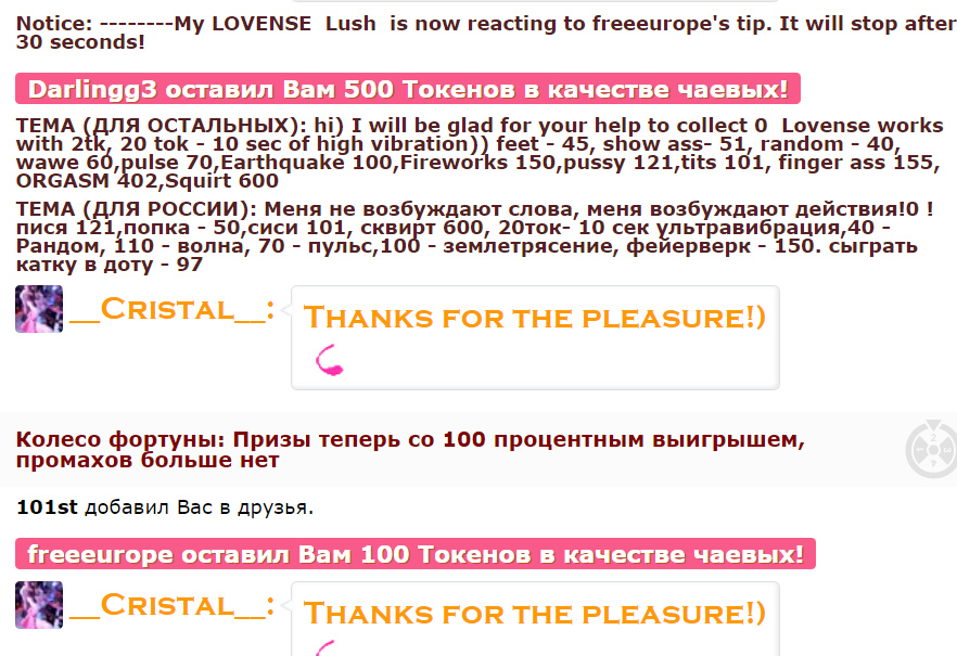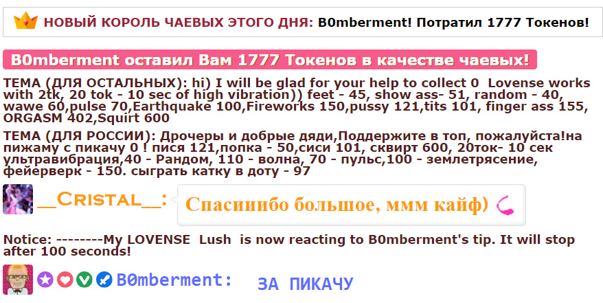 By clicking the button, you will be raising _Cristal_ to the first position on the main page for 60 seconds. During this time the model's chat room will become much more visible and incredibly popular! A notification about your action will appear in the chat, visible to the model and the other chat users. _Cristal_ will be sure to appreciate this gesture and be immeasurably grateful to you!